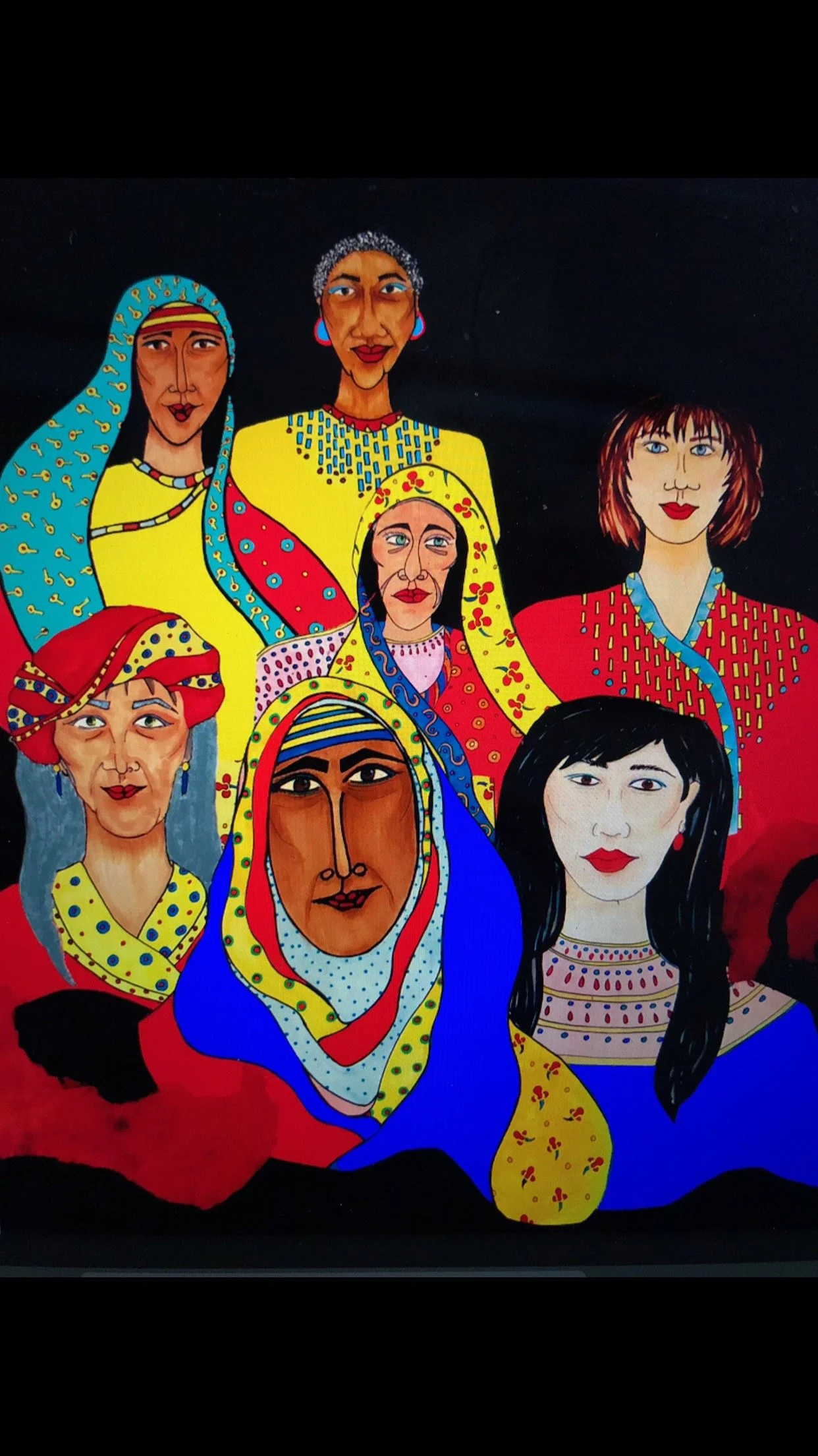 This piece of artwork is special to me for many reasons. In the fall of 2020 Covid was hitting everywhere, and I lost a job that I loved. The kind of job where you smile when you wake up in the morning knowing you’ll see the many faces that bring joy to all. Isolated and depressed I signed up for online literature courses and took long walks with my mask on, of course. In early 2021 I began to draw again. I hadn’t picked up an artist tool for many years. I have always been drawn to faces, especially eyes. These images of The Women began to appear on paper. I would draw one, then another and another. They were all single images that I colored in bright reds, blues, and yellows. I was coming back to life in the midst of chaos in the outside world. This was a significant transition for me. My creativity opened another door back into the world of art and life.